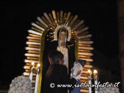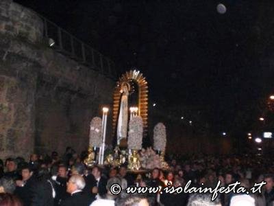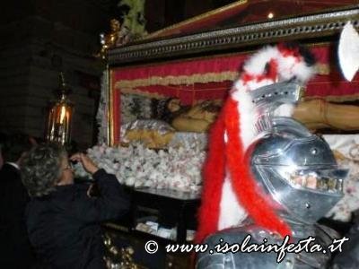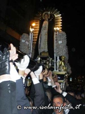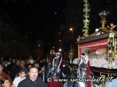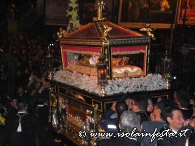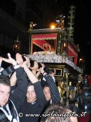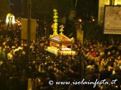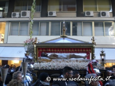Alle ore 19:00 circa, nella affollata Piazza Nascè, il Parroco Don Gioacchino Gammino ha pronunziato la predica a conclusione della Via Crucis. La processione arrivata a notte tarda dinanzi la chiesa parrocchiale di S. Lucia ha sostato un breve periodo, dove poi, tra l’emozione dei fedeli, è stato eseguito l’incontro tra la Madonna Addolorata e il Cristo Morto. Alle ore 01:00 circa, la processione è giunta al carcere Ucciardone dove i fercoli del Cristo e dell’Addolorata vengono issati in alto verso i carcerati come segno di benedizione e per renderglieli visibili oltre il muro che circonda il carcere fino alle loro celle.