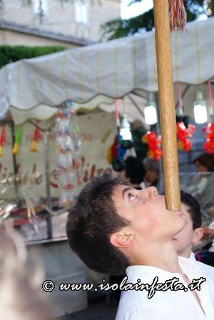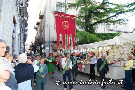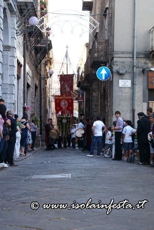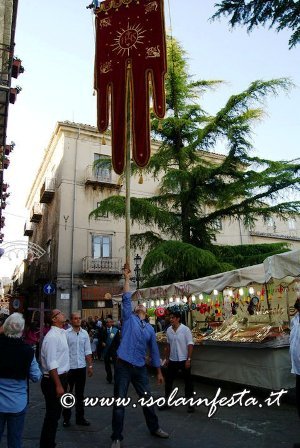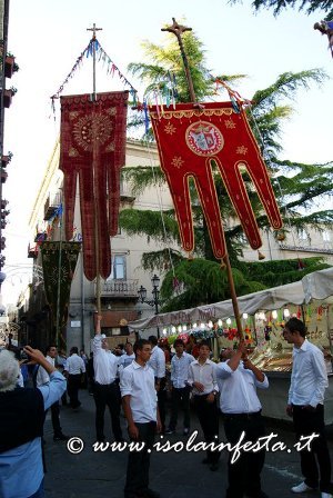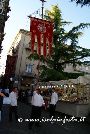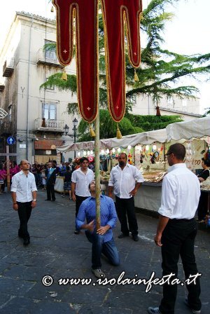 Aprono la processione i grandi stendardi, con cui abilissimi portatori “giocano” a tenerli in equilibrio con le mani, col mento, o con la fronte.