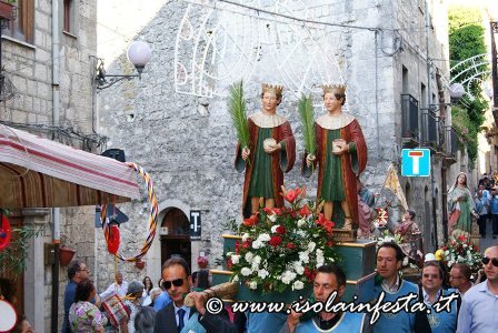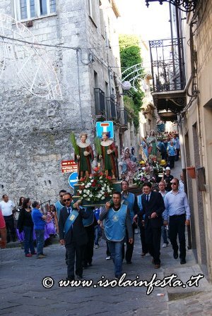 Giorno 25 ha inizio il così detto festino: la sera, dopo la Santa Messa, due piccoli simulacri dei santi patroni sono condotti in processione accompagnati dai devoti. al termine della processione i fuochi artificiali e il canto dell’inno segnano il ritorno in chiesa. le due statue tornano in chiesa correndo.