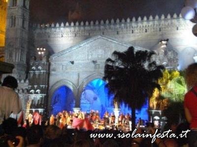 Il Festino di S. Rosalia giunto alla sua 384° edizione ha visto sfilare lungo il Cassaro, ossia Corso Vittorio Emanuele, tre carri di uguale importanza, rispettivamente in ordine di sfilata, Il Carro del Sentimento popolare, Il Carro della Città, con i suoi Quattro Mercati Storici (Capo, Ballarò, Vucciria, Borgo Vecchio) e il Carro della Rosa oltre le spine. La manifestazione ha avuto inizio nel Sagrato della Cattedrale palermitana, con una orazione musicale e diversi brani, alternati da canti etnici, tradizionali, gregoriani e contemporanei, rievocando l’arrivo e la liberazione dalla peste. Al canto del coro si è unita in una cornice unica ed irripetibile, la straordinaria, artistica e teatrale facciata della Cattedrale, sapientemente illuminata per l’occasione.