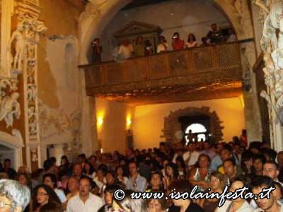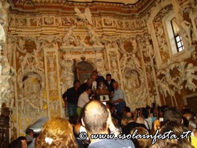 La cappella stracolma di gente diviene muta non appena il mastro (che ha ricevuto in consegna le chiavi) comincia le operazioni di apertura: l’emozione cresce ad ogni giro di chiave, poi finalmente la grata si apre, si apre anche l’anta con il vetro e… rieccola! dopo un anno la Madre Sant’Anna torna tra i suoi devoti. Lacrime, preghiere, gridi di evviva accompagnano il lunghissimo applauso che investe l’interno e l’esterno del castello, i mortaretti risuonano nell’aria, la banda suona a festa, le campane a distesa….è festa!