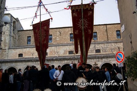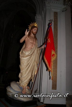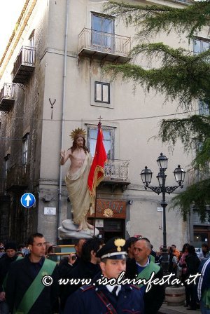 Il Cristo Risorto esce dalla Matrice accompagnato da una festosa processione portato a spalla dalla congregazione del Santissimo Salvatore. E’ proprio questo simulacro a partire per primo e a passare dalla piazza del Popolo. Lo precedono i portatori dello stendardo maggiore che eseguono evoluzioni spettacolari; il clima di gioia è palpabile: CRISTO é RISORTO!