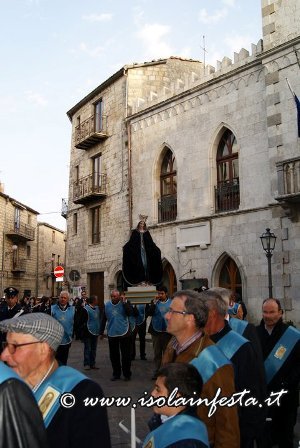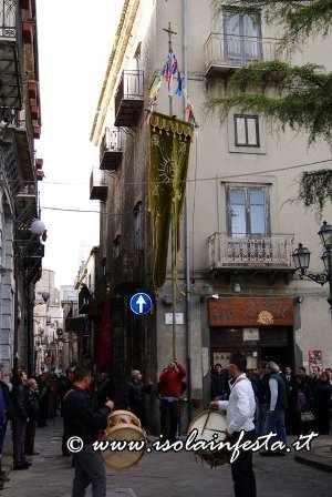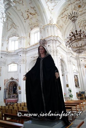 Poco più tardi esce la processione di Maria Santissima velata di nero, che parte da un’altra chiesa. La processione è funebre. Il grande stendardo è avvolto e portato in processione in maniera orizzontale, i tamburi suonano a lutto e anche la banda musicale intona marce funebri per tutto il percorso, e pure il crocifisso della confraternita è velato di viola.