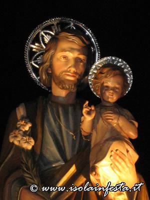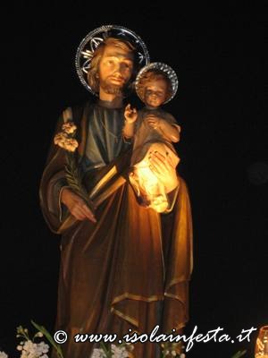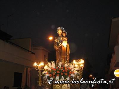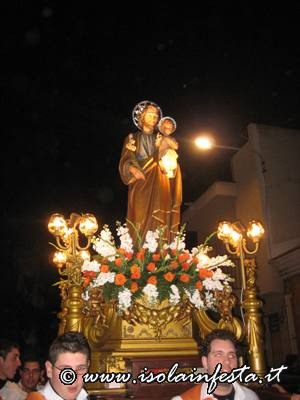 La sera della giornata di festa, il simulacro del Santo, posto sul fercolo infiorato, esce dalla chiesa parrocchiale accolto dal lancio di carte multicolori e dai fuochi d’artificio, e percorre le vie del borgo marinaro fino a tarda serata.