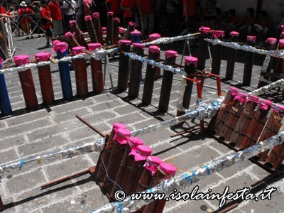Appena incomincia ad affacciarsi S. Paolo tutti i devoti incominciano ad inneggiare verso di lui come la sera precedente, gridando ed alzando le mani verso di lui, ed appena incomincia ad affacciarsi sul sacrato una grande e continua esplosione di decine di mortai che contengono migliaia di “nzareddi”, che consistono in lunghe strisce di carta colorata che vengono coreograficamente sparati in cielo da terra e dal campanile per poi ricadere giù in mezzo alla folla con un effetto molto particolare; contemporaneamente esplodono in aria una grande quantità di fuochi che annunciano a tutto il paese ed ai paesi limitrofi che in quel momento S. Paolo sta uscendo trionfalmente dalla sua Basilica.