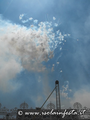 La quantità di carta che sale in cielo e poi lentamente riscende è tale che non si riesce a vedere più niente, S. Paolo neanche si vede; questo effetto dura per circa tre minuti, ma i fuochi, due grandiosi spettacoli pirotecnici sparati uno in sequenza all’altro con una grande rapidità, riempiono il cielo ed assordano i presenti per circa venti minuti: molti dicono che questa sia anche l’uscita più assordante che possa esistere.
