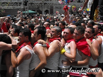 I portatori dei due fercoli fanno una fatica enorme perchè, anche essendo in molti a portarli sulle spalle, i fercoli sono molto pesanti e tutto il loro sforzo e la loro stanchezza si vede dalle spalle rosse e da tutto il corpo sudato per lo sforzo, ed ovviamente per il forte caldo; essi sono vestiti in canottiera e durante tutta la processione portano a spalla la vara senza neanche avere un attimo di sosta, quindi tutto il tempo sulle loro spalle.