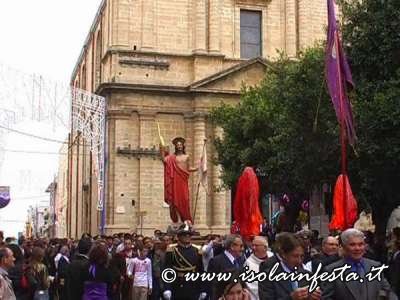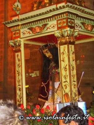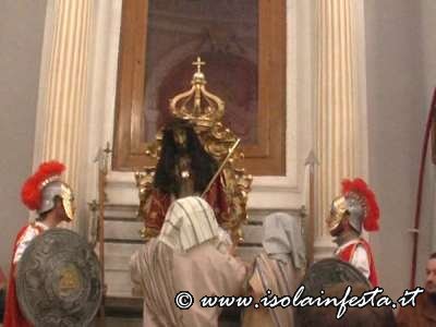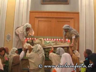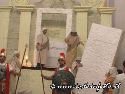 Ora all’interno della chiesa si svolge una funzione davvero coinvolgente nata appena qualche anno fa da un’idea dei portatori. Ed in mezzo ad una chiesa madre gremitissima di fedeli e curiosi, viene prelevato dalla sua vara il Cristo Morto e viene portato in processione fino all’altare maggiore dove è allestito un grande sepolcro, seguito dai portatori, dalle tre Marie e da San Giovanni. Il simulacro poi viene deposto e avvolto in un lenzuolo nel sepolcro e una grossa pietra chiude Gesù nella sua tomba, custodito dai soldati romani messi ai piedi della costruzione, in attesa della Veglia Pasquale del Sabato Santo, quando da quel sepolcro esce al Gloria trionfalmente il Cristo Risorto tra scene di luce, fumo, musica e terremoto. Alla fine di questa funzione come da tradizione viene prelevato dalla sua vara l’ECCE HOMO e viene deposto ai piedi della sua nicchia in chiesa, dove devoti tutti vanno a toccare il simulacro e a baciarlo benedicendo ognuno il suo bambino.