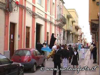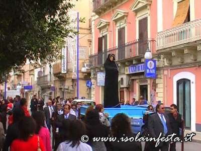 La Madonna Addolorata invece esce dal salone parrocchiale, avvolta in un manto completamente nero e preceduta da uno stendardo anch’esso avvolto e non sventolante in segno di lutto.