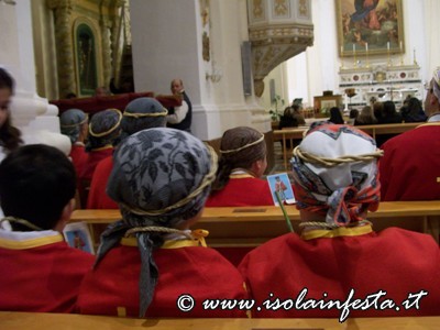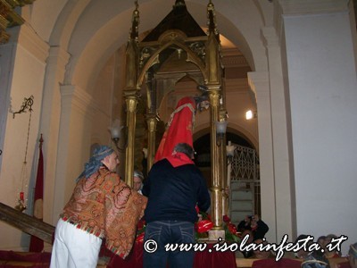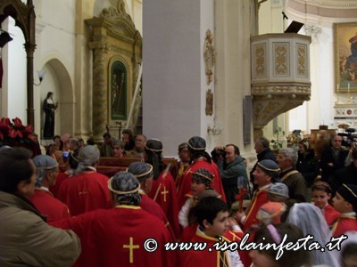Alle ore 17.00 inizia la funzione religiosa con il sacerdote, che indossa paramenti rossi, il quale si prostra a terra e rimane in silenzio, pregando per qualche istante in tale posizione. Quando si rialza ha inizio la celebrazione liturgica suddivisa in tre momenti: