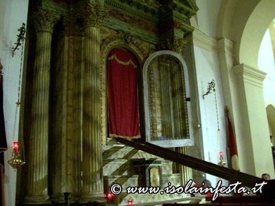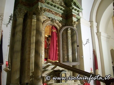 L’altare del SS. Cristo, costruito agli inizi del ‘900, è in pietra da taglio falsamente marmorizzato. Quattro colonne corinzie sorreggono un frontone, al centro del quale viene riportato uno stemma con i simboli della passione ed infine chiude l’ estremità una grande corona. La nicchia ha lo sportello in legno e l’interno ricoperto da una pregiata stoffa damascata; per tutto l’intero anno rimane sempre coperta da una tenda damascata di color rosso porpora, in segno di devozione e di rispetto; viene aperta solamente nei Venerdì di Quaresima, il giorno del Venerdì Santo e per la festa di San Sebastiano.