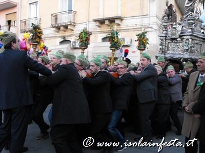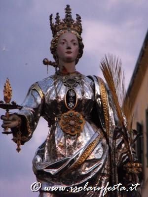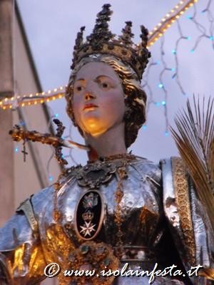 Precede il simulacro argenteo l’urna reliquiaria della Santa, portata a spalla dalle donne, mentre dietro, tra due file di alti candelabri, sfila il prezioso e veneratissimo simulacro argenteo della Santa Vergine e Martire Lucia, portato a spalla dai devoti in abito votivo, alcuni provenienti anche dall’estero per voto alla Santa Patrona.