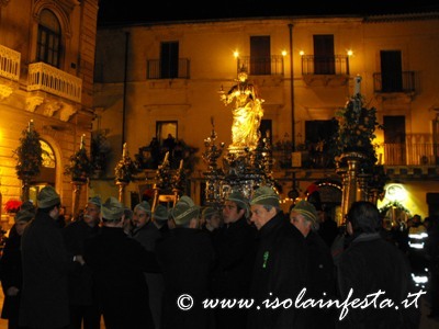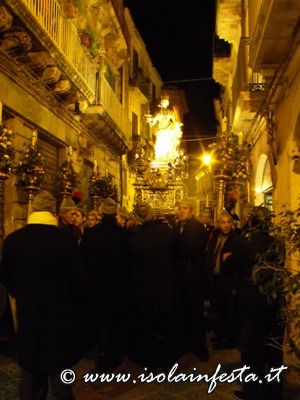 Precede il simulacro argenteo l’urna reliquiaria della Santa, portata a spalla dalle donne, mentre dietro, tra due file di alti candelabri, sfila il prezioso e veneratissimo simulacro argenteo della Santa Vergine e Martire Lucia, portato a spalla dai devoti in abito votivo, alcuni provenienti anche dall’estero per voto alla Santa Patrona.