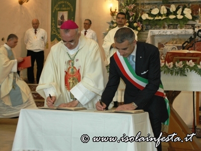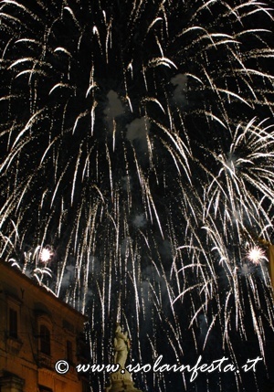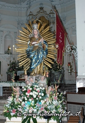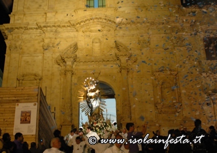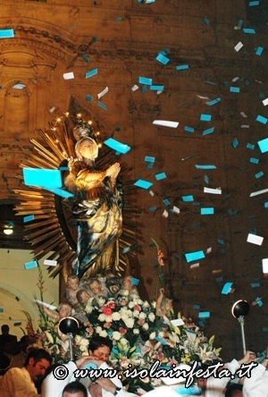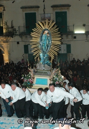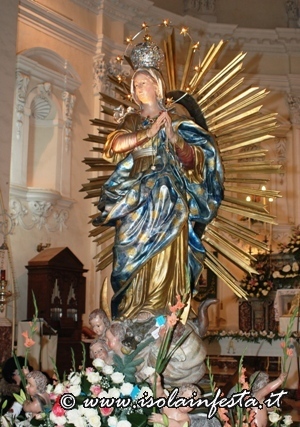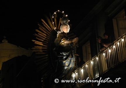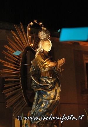 La Santa Messa vespertina delle ore 17,00 precede la trionfale uscita del simulacro dell’Immacolata che viene accolto sul sagrato dallo sparo della “moschetteria” e lancio di migliaia di volanti azzurri e bianchi. Il simulacro, preceduto dalle Confraternite della città, con i loro variopinti stendardi e seguito dalle note del corpo bandistico, inizia la sua processione lungo le principali vie della parte bassa della città. La processione si alterna annualmente, percorrendo un anno la parte alta, e l’anno successivo quella bassa. Prima della conclusione il simulacro fa ingresso in Cattedrale per una breve sosta e un momento di preghiera comunitario. Al rientro in chiesa, intorno alle ore 20,30 un suggestivo spettacolo pirotecnico conclude i solenni festeggiamenti.