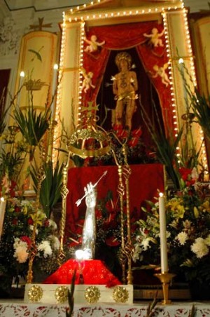L’ultima domenica del mese, prima della S. Messa Solenne della sera, il SS. Sacramento viene tolto dall’altare maggiore per dare spazio al simulacro di S. Sebastiano che viene svelato nuovamente.