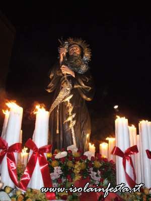 Dopo la novena, la III DOMENICA di PASQUA è il giorno della processione: la mattina ci sono tre S. Messe in preparazione alla processione, alle ore 15:55 si sente da lontano la banda musicale che intona le marce allegre, (dette “I MARCE DI SANTU PATRI” vengono suonate solo per questa processione) mentre i responsabili accendono i lunghi e grossi ceri che sono posizionati sulla “vara”. I devoti fremono, alle 16:00 in punto con il grido ” W. SAN FRANCESCO DI PAOLA”, la banda intona la “CASA RICORDI” (marcia tradizionale), “U’ ZU’ CARLO” (il presidente del comitato) dà due colpi di campana, e si alza il Santo da terra, e con la tradizionale “annacata” si varca la il sagrato della chiesa.