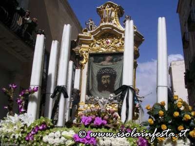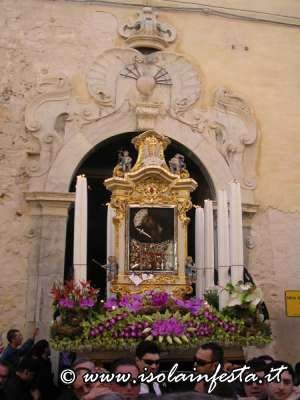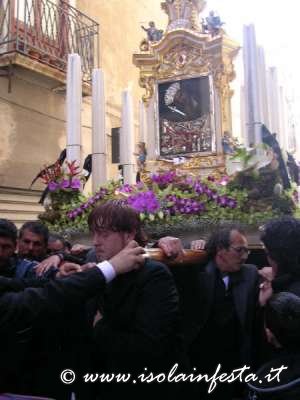 L’immagine dell’Addolorata è incastonata dal 1778 in una “vara” in legno in stile barocco, ideata dall’architetto Luciano Gambina nella seconda metà del ‘700. Nella parte posteriore della “vara” è collocato un santo volto di Gesù coronato di spine, impresso nel drappo della Veronica e sorretto da un angelo. L’immagine è attribuita al Ferro. Il volto del Nazareno è raffigurato con tratti somatici tipicamente mediterranei e la stessa corona di spine si discosta dalla iconografia classica.